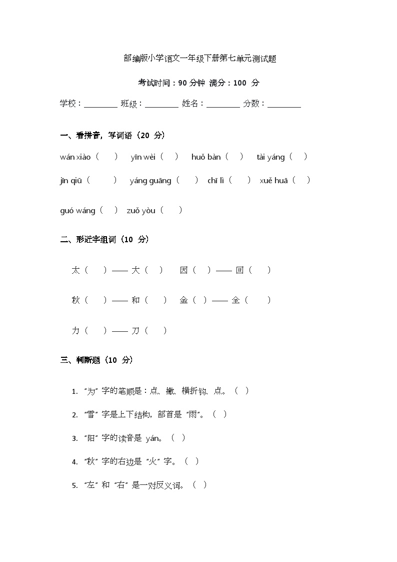 亲爱的家长们,鸡娃题库为您推出统编版小学语文一年级下册第七单元测试题📒。这套测试题含完整答案,高清可打印,是检验第七单元学习成果的理想工具。