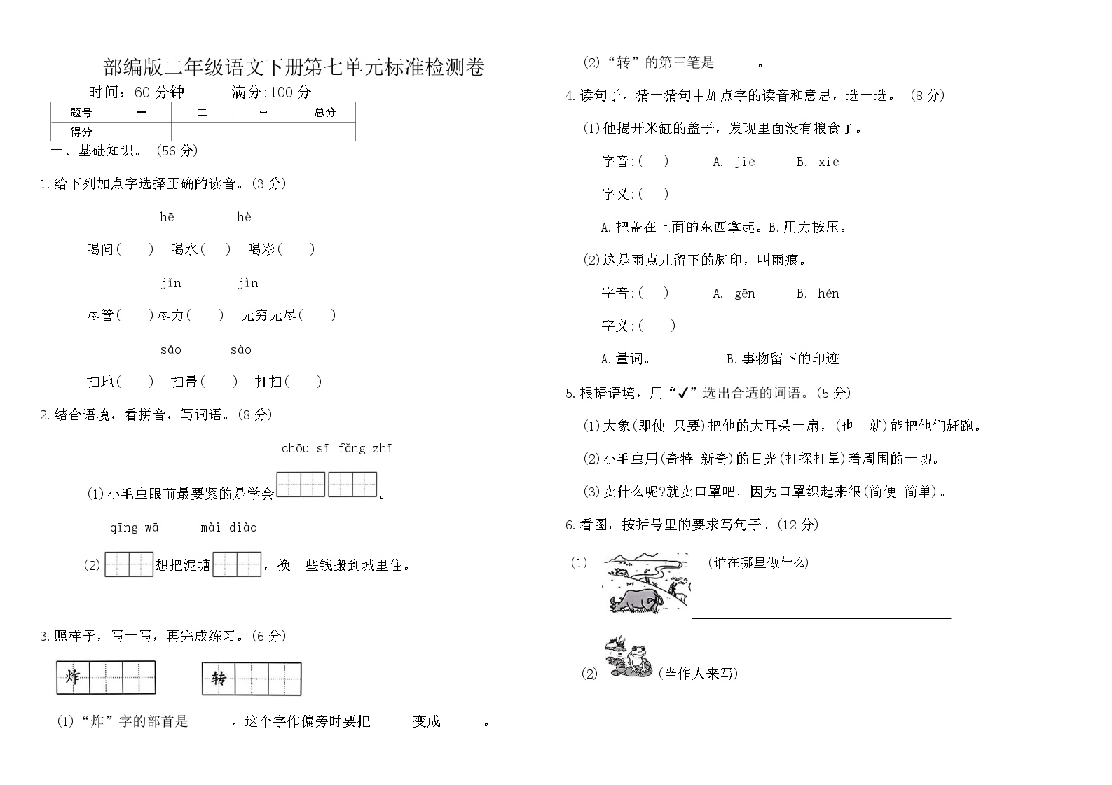 亲爱的家长朋友们,部编版小学二年级语文下册第七单元标准检测卷火热发布!这份高清可打印的检测卷,是检验学习成果的得力助手。