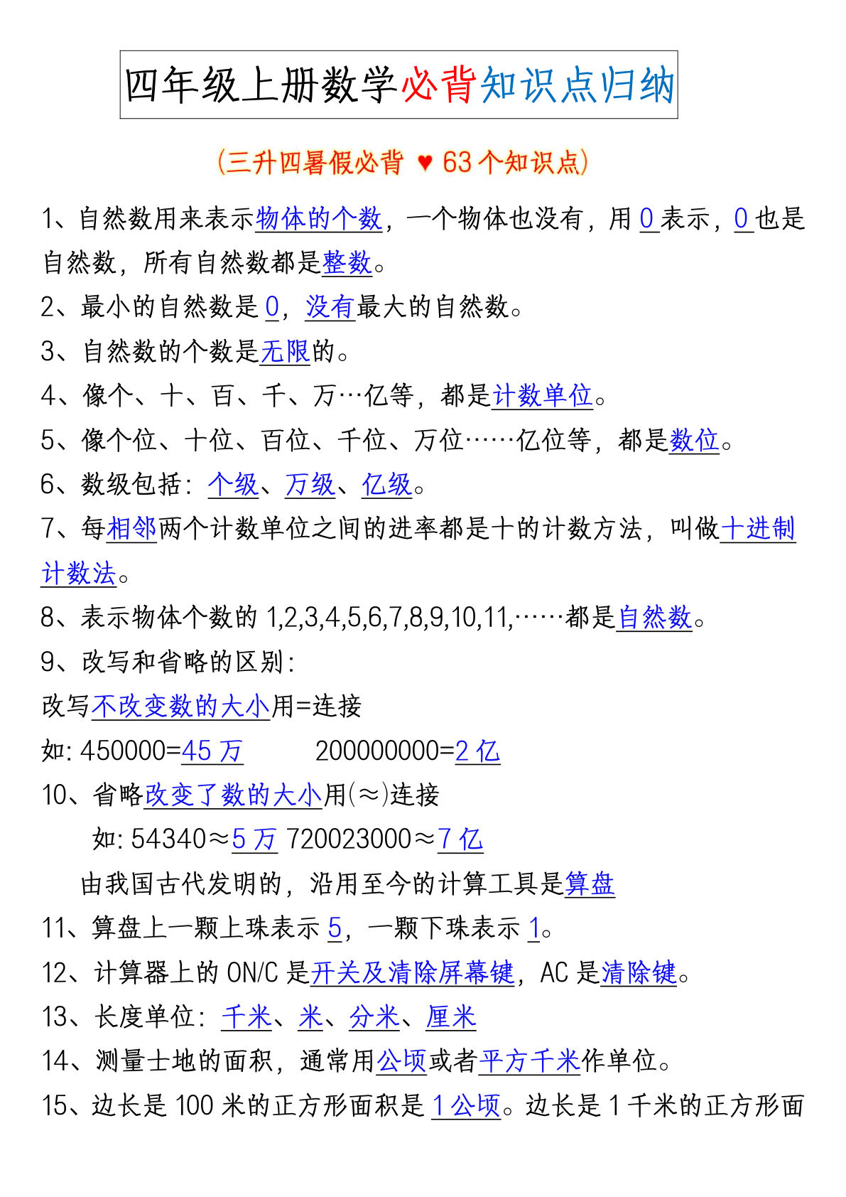 四年级数学上册知识点是小学阶段的重要转折点,这套《三升四暑假必背63个知识点》系统整理四年级上册数学核心概念,帮助学生提前掌握关键内容,为新学期数学学习打下坚实基础。