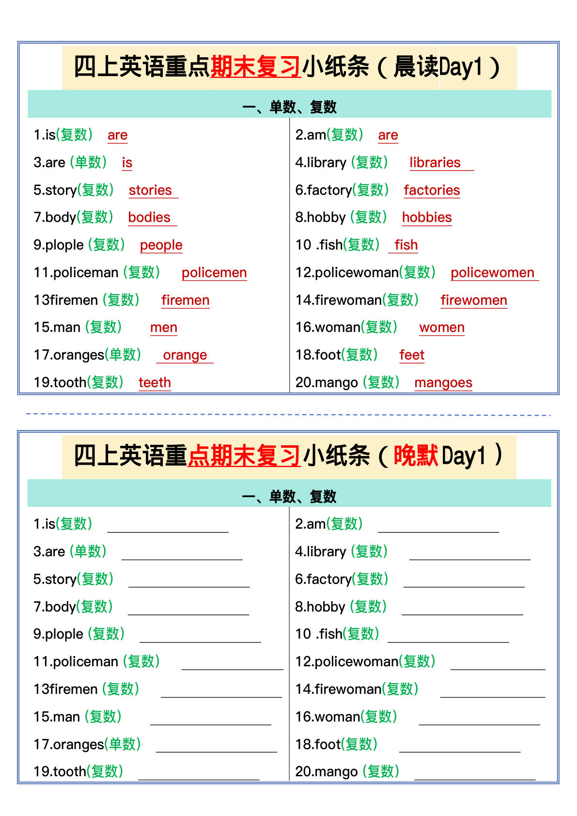这套四年级上册英语期末复习小纸条是小学英语语法速记的黄金资源,采用晨读+晚默双模式设计,系统归纳8大语法专题和200+核心知识点,帮助学生高效备战期末考试。