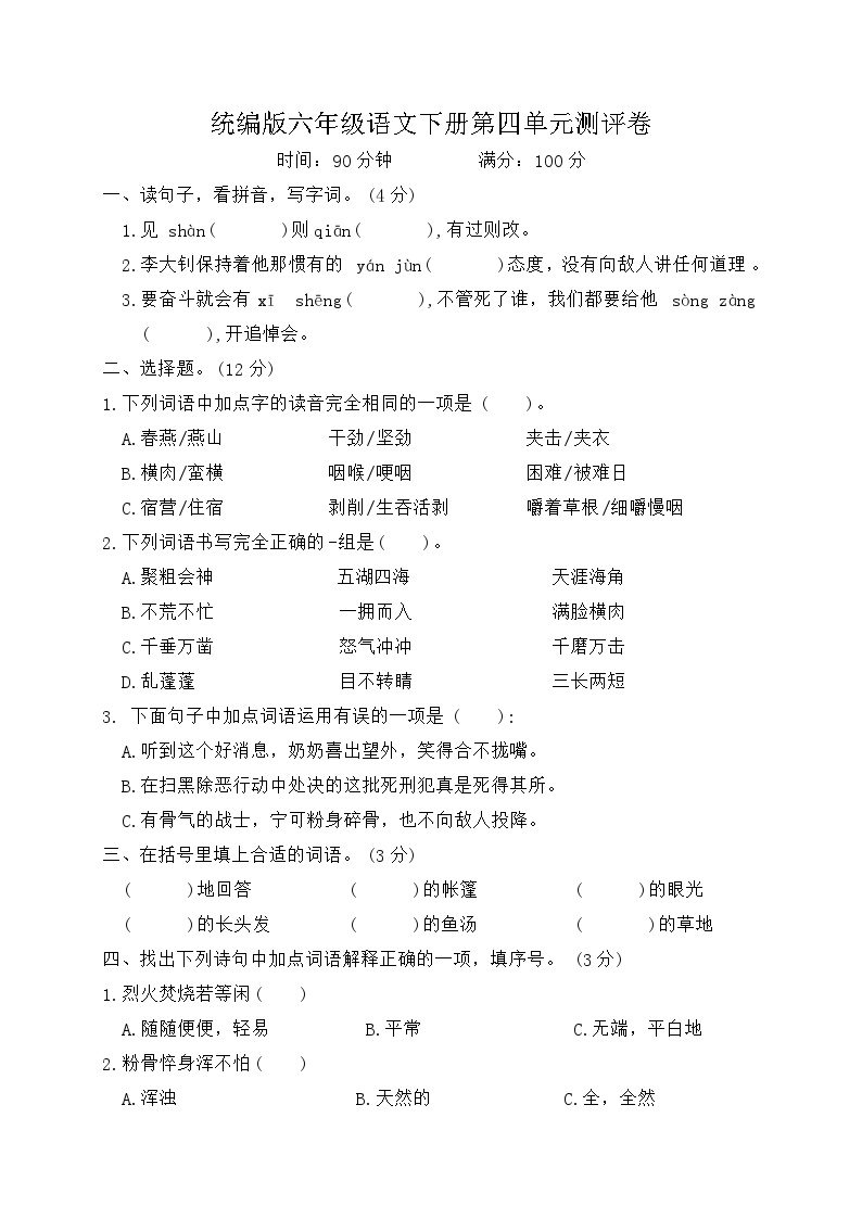 期中复习好帮手!统编版六年级下册语文第四单元测试A卷全新发布。本套试卷全面检测学生对第四单元议论文和文言文的理解掌握程度,包含选择题、填空题、阅读分析和习作等题型,难易梯度合理,并配有完整答案解析。现在打开鸡娃题库网http://jiwatiku.cn,即可免费下载高清PDF版本,支持直接打印使用。这套资源特别适合期中复习阶段使用,能帮助学生系统梳理知识点,熟悉考试题型,提升答题效率。我们网站还提供其他年级段丰富的教学资源,所有资料均免费共享,是老师和家长的优质教育资源库,赶快来获取吧!