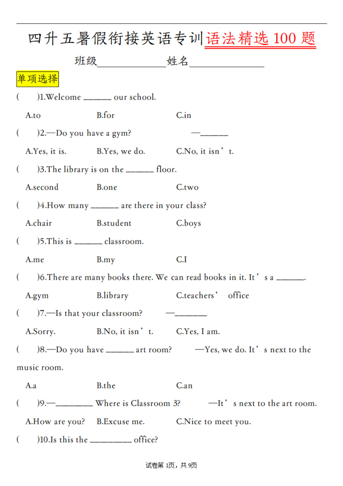 这份《四升五暑假衔接英语专训语法精选100题》通过系统训练,帮助学生全面掌握小学英语核心语法知识,是四升五学生暑假提升英语成绩的优质学习资料。