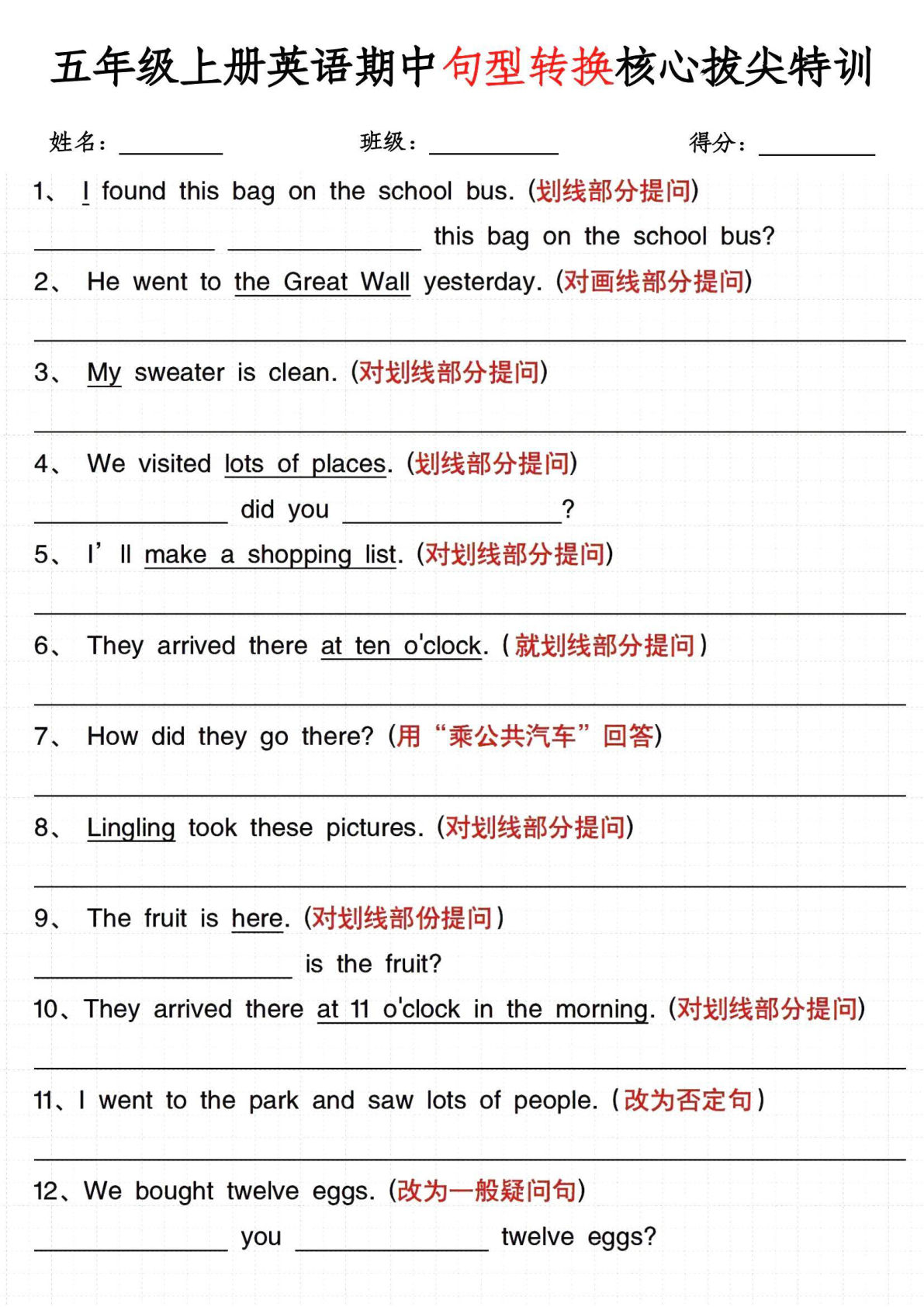 这份《五年级上册英语期中句型转换核心拔尖特训》通过37道精选题目,帮助学生全面掌握英语核心句型转换技巧,是五年级学生提升英语成绩的优质学习资料。