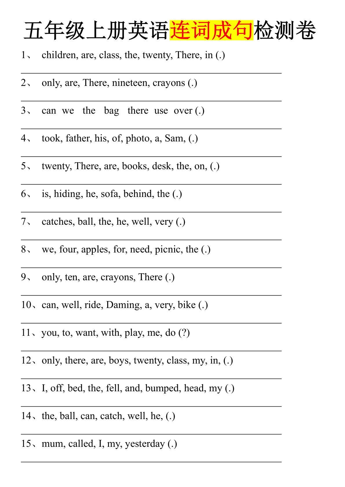 这份《五年级上册英语连词成句检测卷》是专门为五年级学生设计的英语句型训练资料,包含50道精选连词成句题目,全面覆盖小学英语核心句型结构,帮助学生掌握英语基本句型和语法规则。