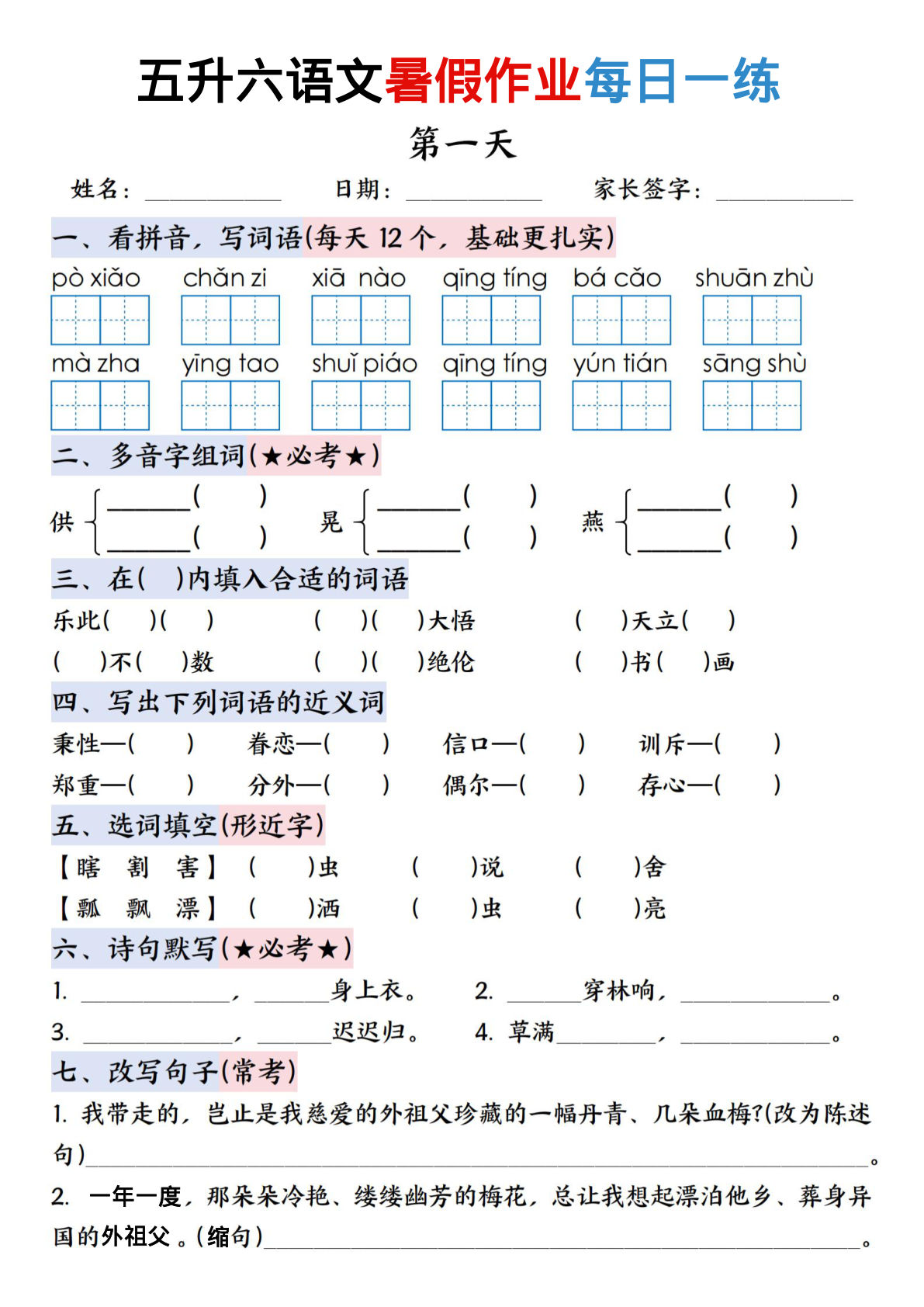 教学价值:这套资料既适合学生自主练习,也可作为教师暑期辅导材料。通过循序渐进的每日训练,帮助学生顺利过渡到六年级语文学习,为新学期打下坚实基础。
