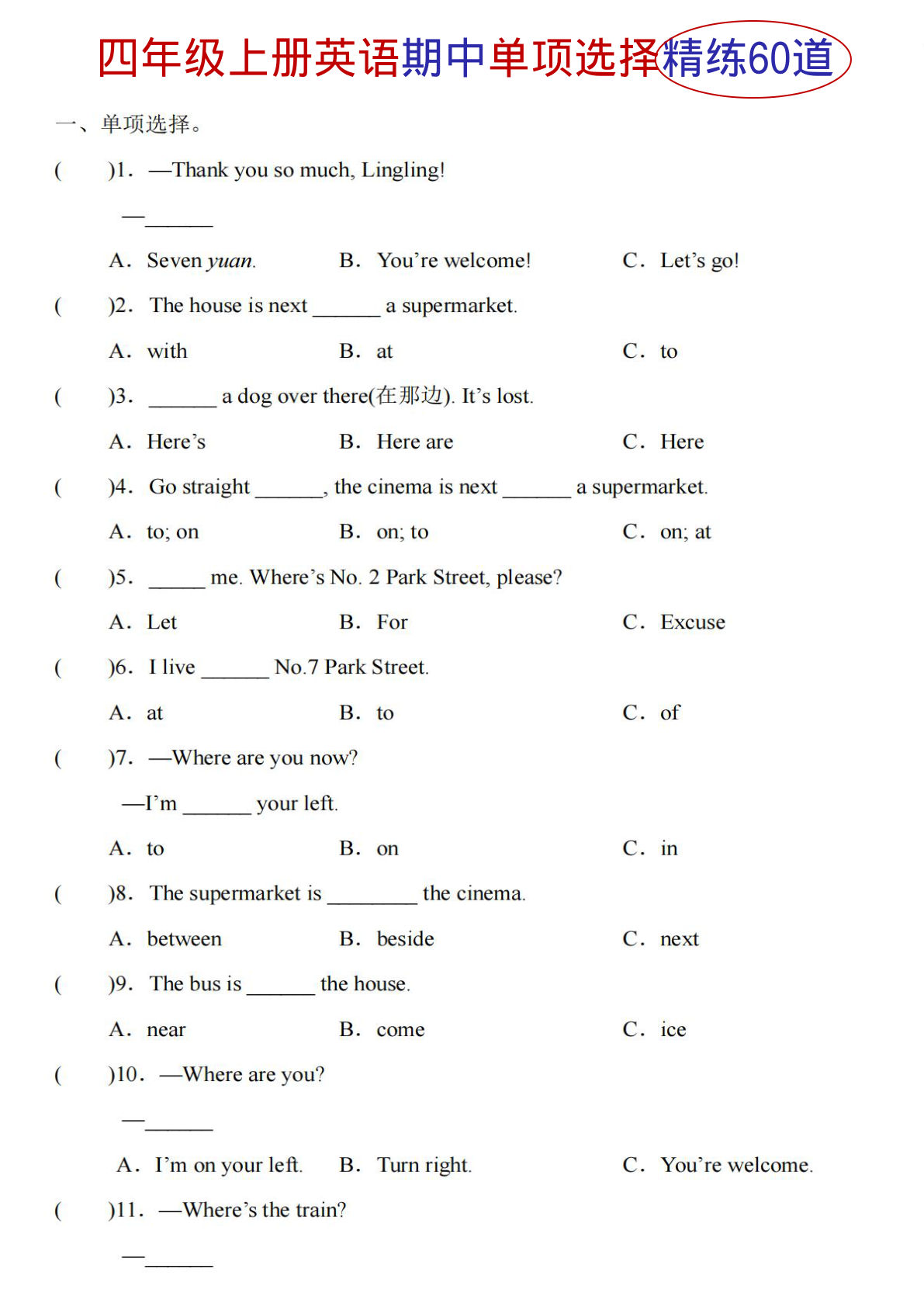 这套四年级上册英语期中单项选择精练是小学英语语法训练的精品资源,包含60道高频考题和完整答案解析,覆盖介词用法、时态判断、情景交际等核心考点。