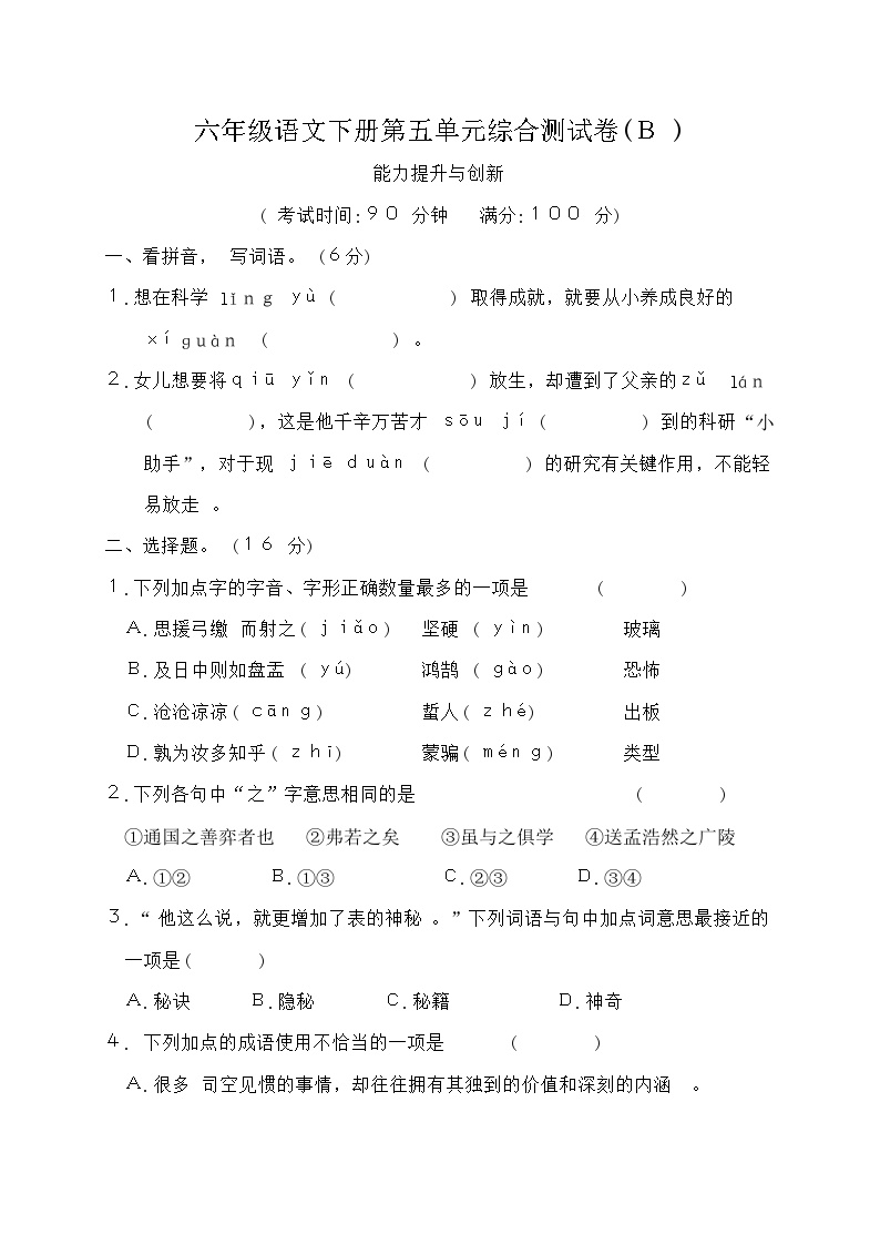 统编版六年级语文下册第五单元测试B卷现已开放下载!本套试卷作为A卷的补充版本,重点强化小说阅读分析和创意写作能力的考察。试卷题型设计新颖,包含创新阅读题和拓展写作题,难度较A卷有明显提升。所有题目均配有详细解析答案,便于学生自主学习。您只需访问鸡娃题库http://jiwatiku.cn,即可免费获取高清PDF版本,支持家庭打印机直接输出。这套B卷特别适合学有余力的学生进行能力拓展训练,也可作为教师分层教学的优质资源。我们网站还提供其他单元的测试资源,全部免费共享,欢迎收藏使用!