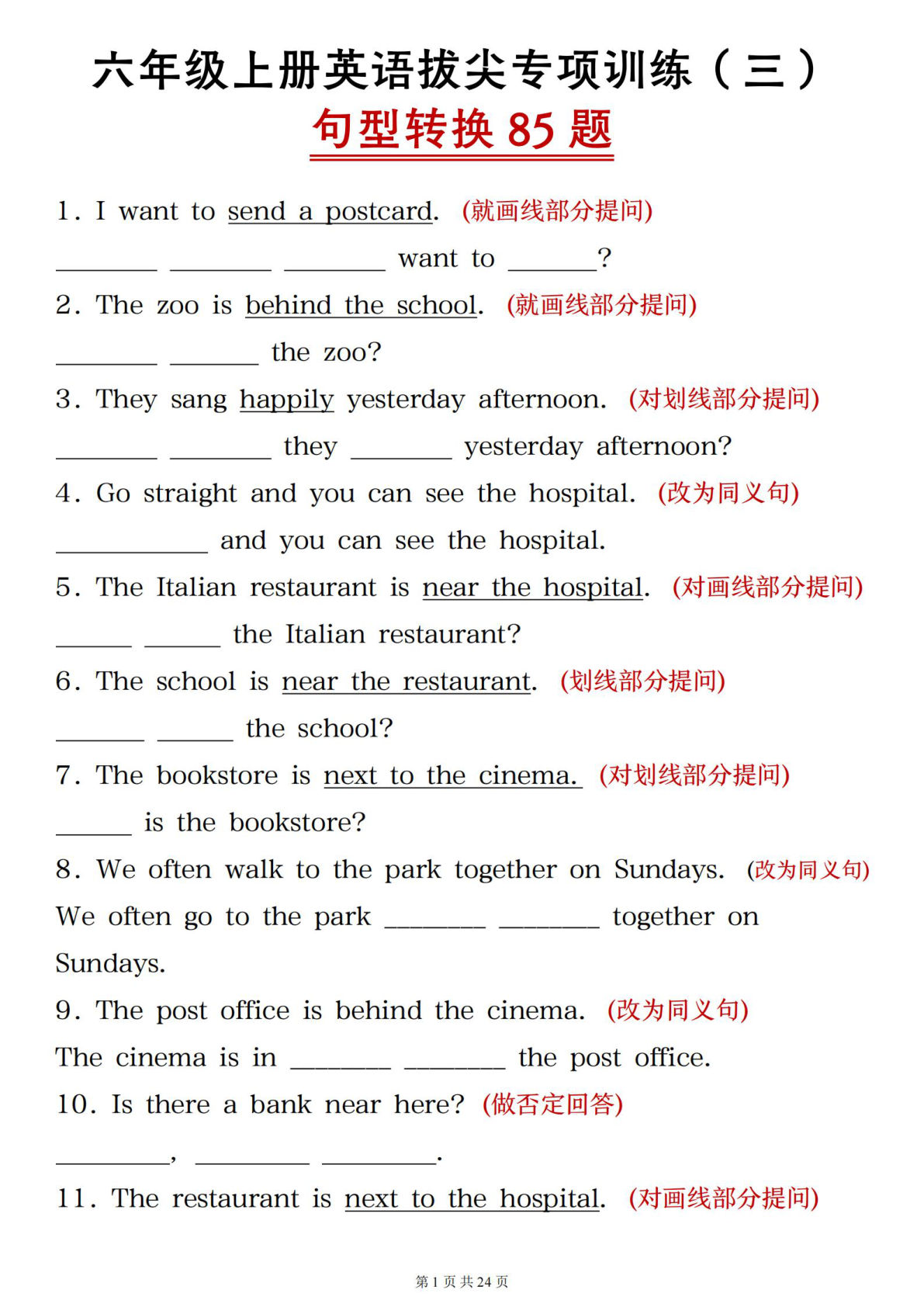 这份《六年级英语句型转换85题》是专为六年级学生设计的语法强化训练资源,包含85道不同题型的句型转换练习,全面覆盖小学英语各类句型转换考点。