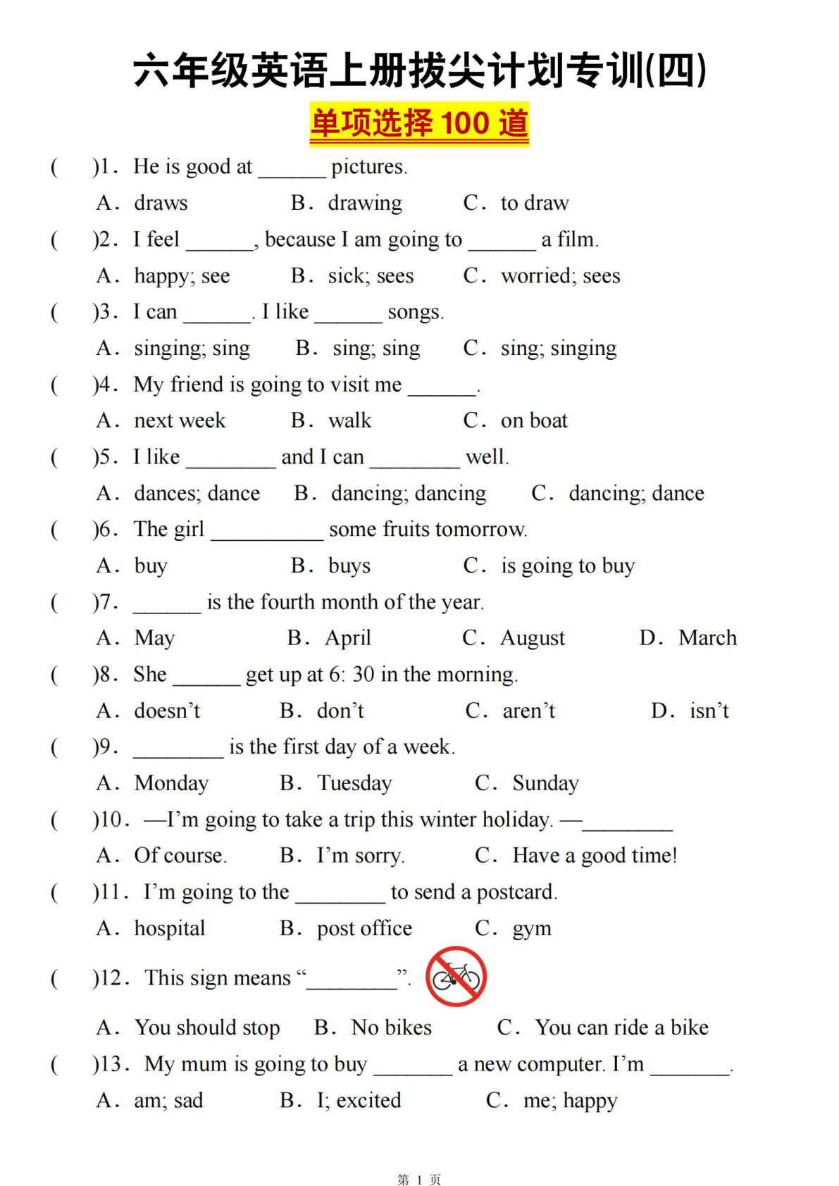 这份《六年级英语拔尖专项训练100题》是专为英语基础扎实的六年级学生设计的高阶训练资源,包含100道精选语法和词汇选择题,帮助学生突破英语学习瓶颈。