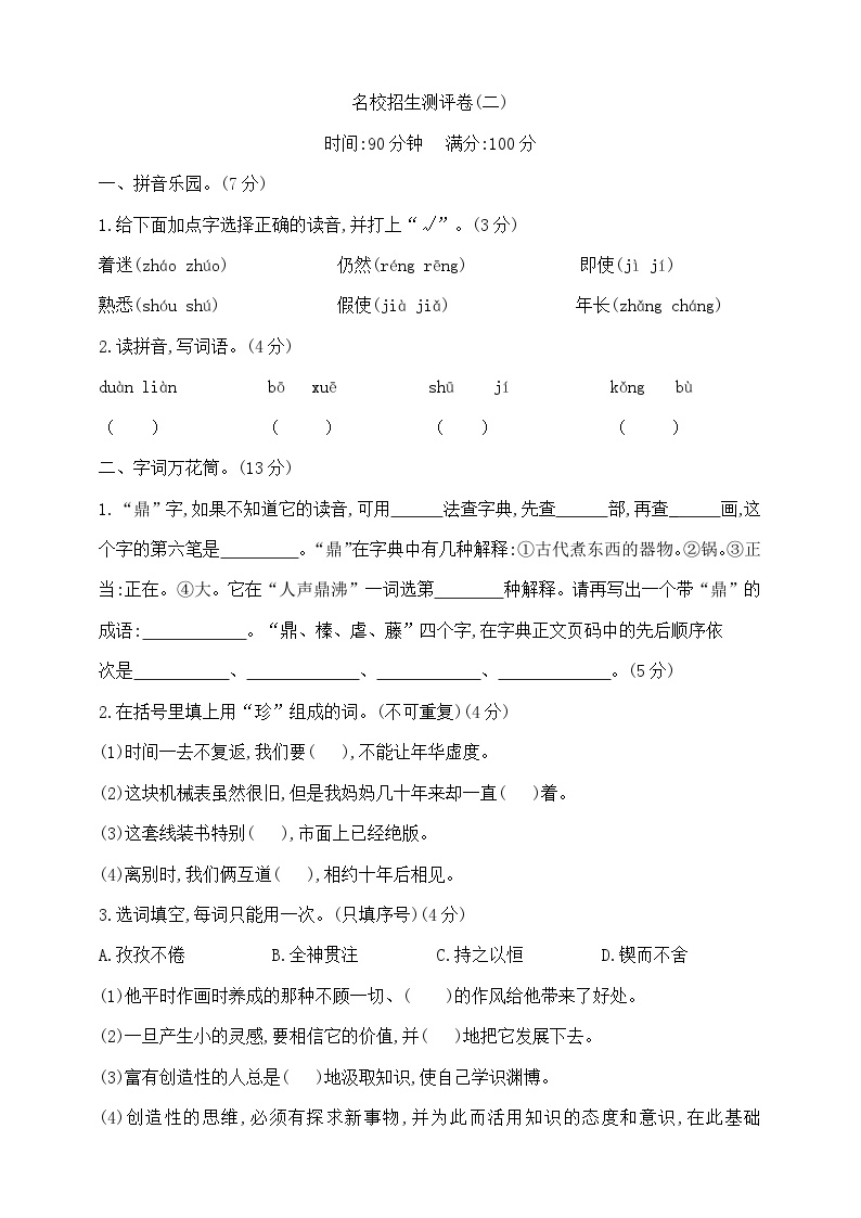 部编版六年级语文下册名校招生测评试卷(二) 含答案可打印免费下载