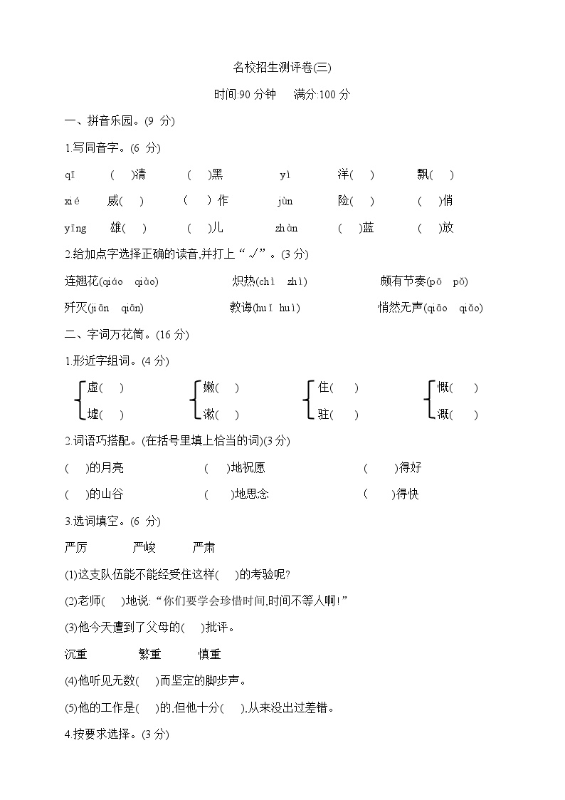 本试卷格式规范,印刷清晰,适合家庭自学或课堂统一使用。通过练习这份名校招生语文测评试卷,学生能够熟悉考试题型,掌握答题技巧,提高应试能力。试题内容紧密结合教材重点,能够有效帮助学生巩固知识,提升语文素养,为进入理想名校做好充分准备。