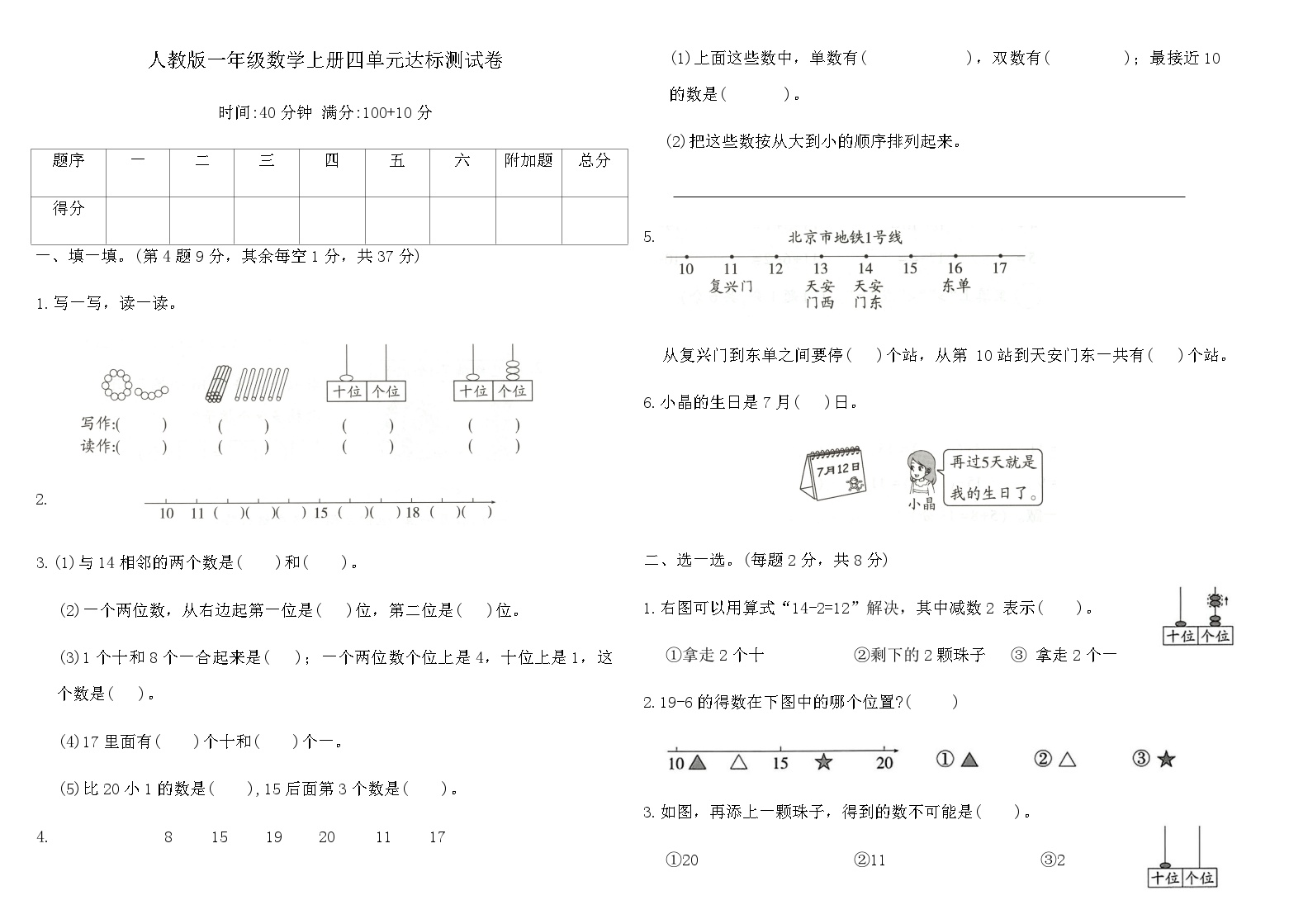 试卷内容全面覆盖第四单元核心知识点,从数字认识到简单应用题,题型设计科学合理。通过系统的练习,学生能够熟练掌握20以内数的读写、比较和运算,为后续数学学习奠定坚实基础。
