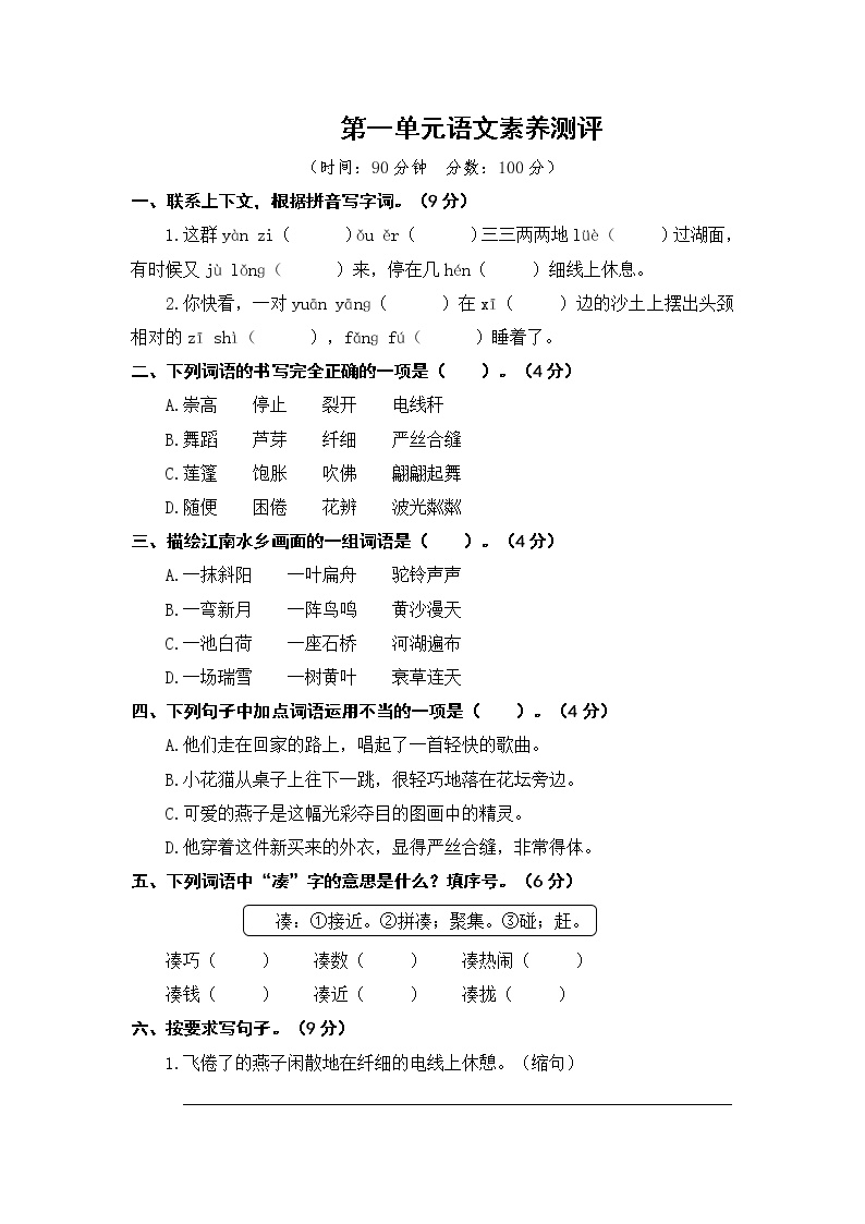 统编版三年级语文第一单元语文素养测评试卷是一份全面检测学生语文能力的优质资源。这份试卷紧扣教材内容,题型丰富多样,涵盖拼音、词语、句子、古诗文、阅读理解与写作等多个方面,适合学生进行单元复习与自我检测。