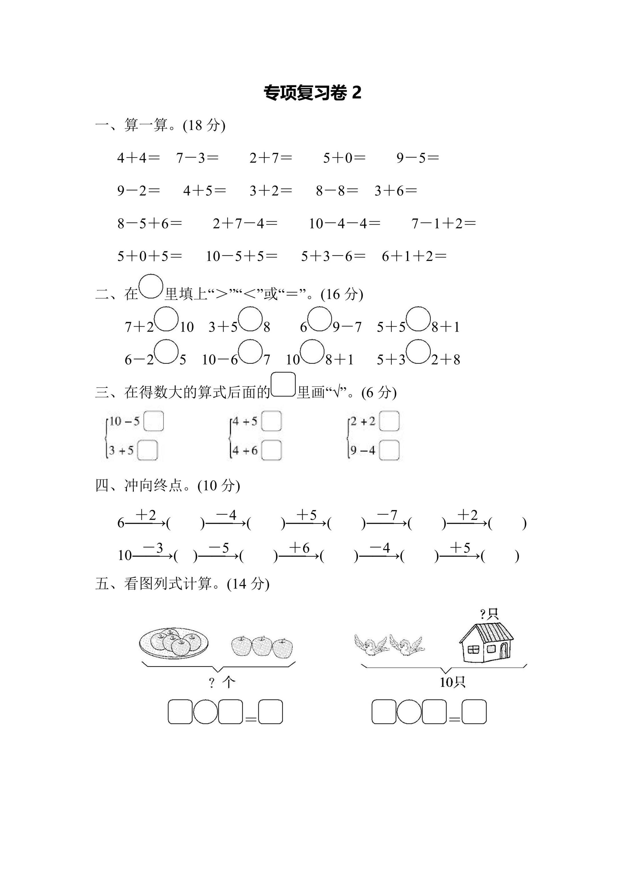 苏教版小学一年级数学上册专项复习卷2专注于10以内加减法的系统训练,是数学基础能力提升的重要工具。这份可打印的数学复习卷包含丰富的练习题和完整答案,适合需要加强计算能力的一年级学生。鸡娃题库致力于提供高质量的免费数学资源,帮助孩子掌握基本运算技能。➕➖ 复习卷2通过循序渐进的方式培养孩子的计算能力,题目设计生动有趣,减少学习压力,让数学练习变得轻松愉快。