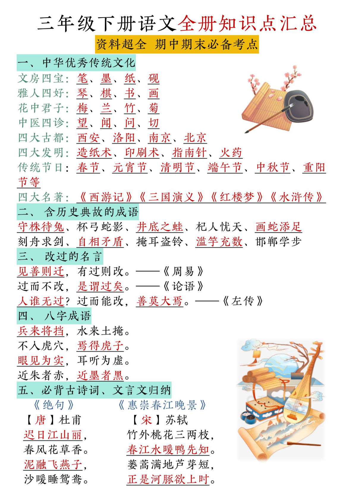 三年级语文下册全册知识点大汇总!期末复习必备,高清打印版助力孩子轻松备考