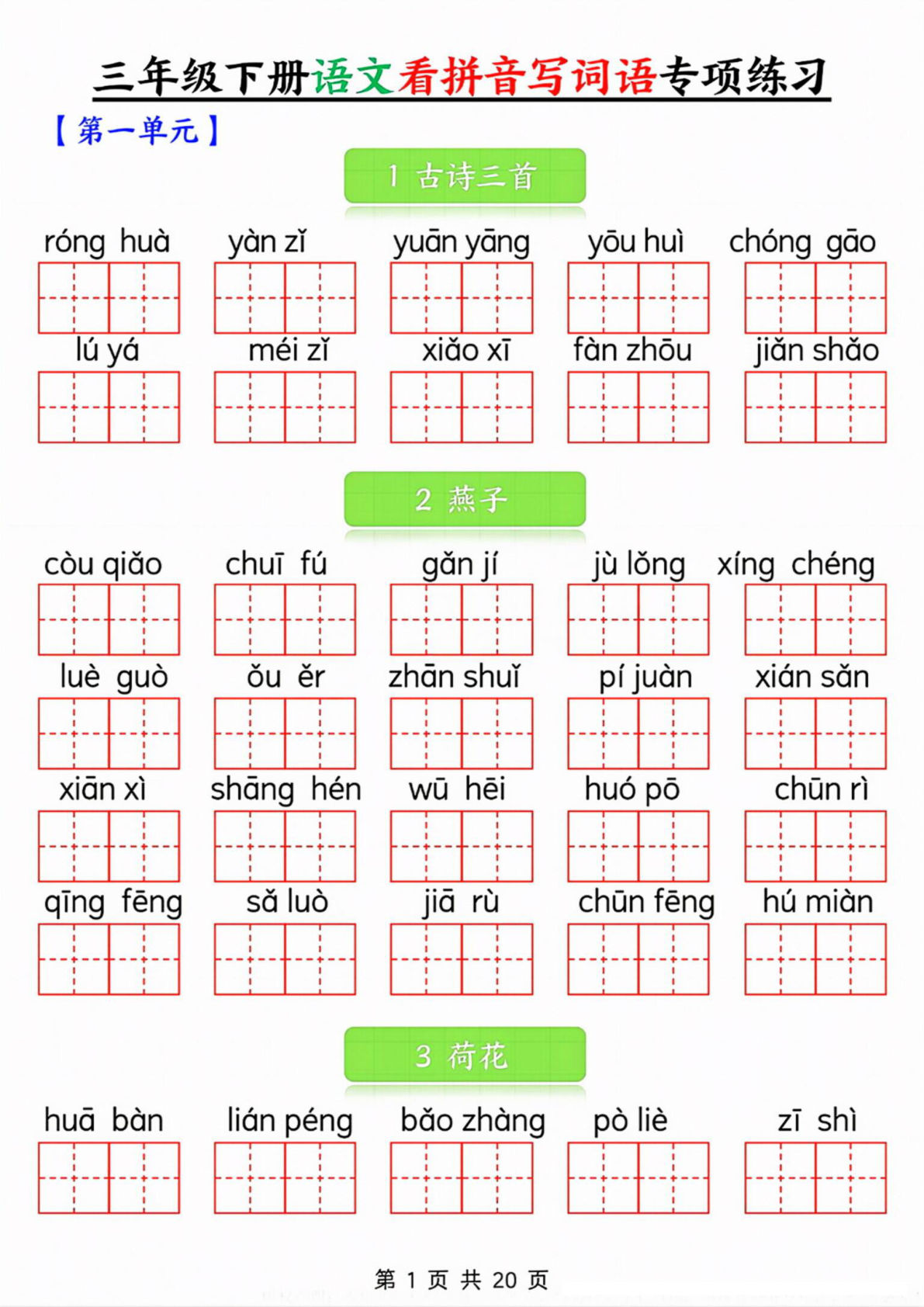 这份 三年级语文拼音写字练习 以20页的详实内容,完整覆盖教材8个单元的重点课文,每单元均按“课文分类+拼音词语+答案对照”逻辑设计,确保练习精准高效:1. 课文专属词语清单 每个单元按课文顺序提取核心词语,以拼音形式呈现练习内容。比如第一单元《古诗三首》收录“róng huà(融化)、yàn zi(燕子)、yuān yāng(鸳鸯)”等描写春夏景色的词语;《荷花》包含“huā bàn(花瓣)、lián peng(莲蓬)、bǎo zhàng(饱胀)”等展现荷花形态的词语;第八单元《慢性子裁缝和急性子顾客》则提取“xìng zi(性子)、bù liào(布料)、jiāo huò(交货)”等体现故事角色与情节的词语,完全贴合课内学习重点。