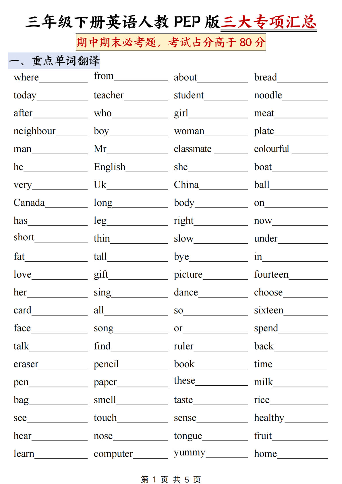 这份《三年级英语下册人教PEP版三大专项汇总》是一份专为小学生设计的英语复习资料。内容涵盖重点单词、短语和句子翻译三大板块,全面覆盖教材核心知识点。适合期中期末复习使用,帮助学生系统掌握英语基础。