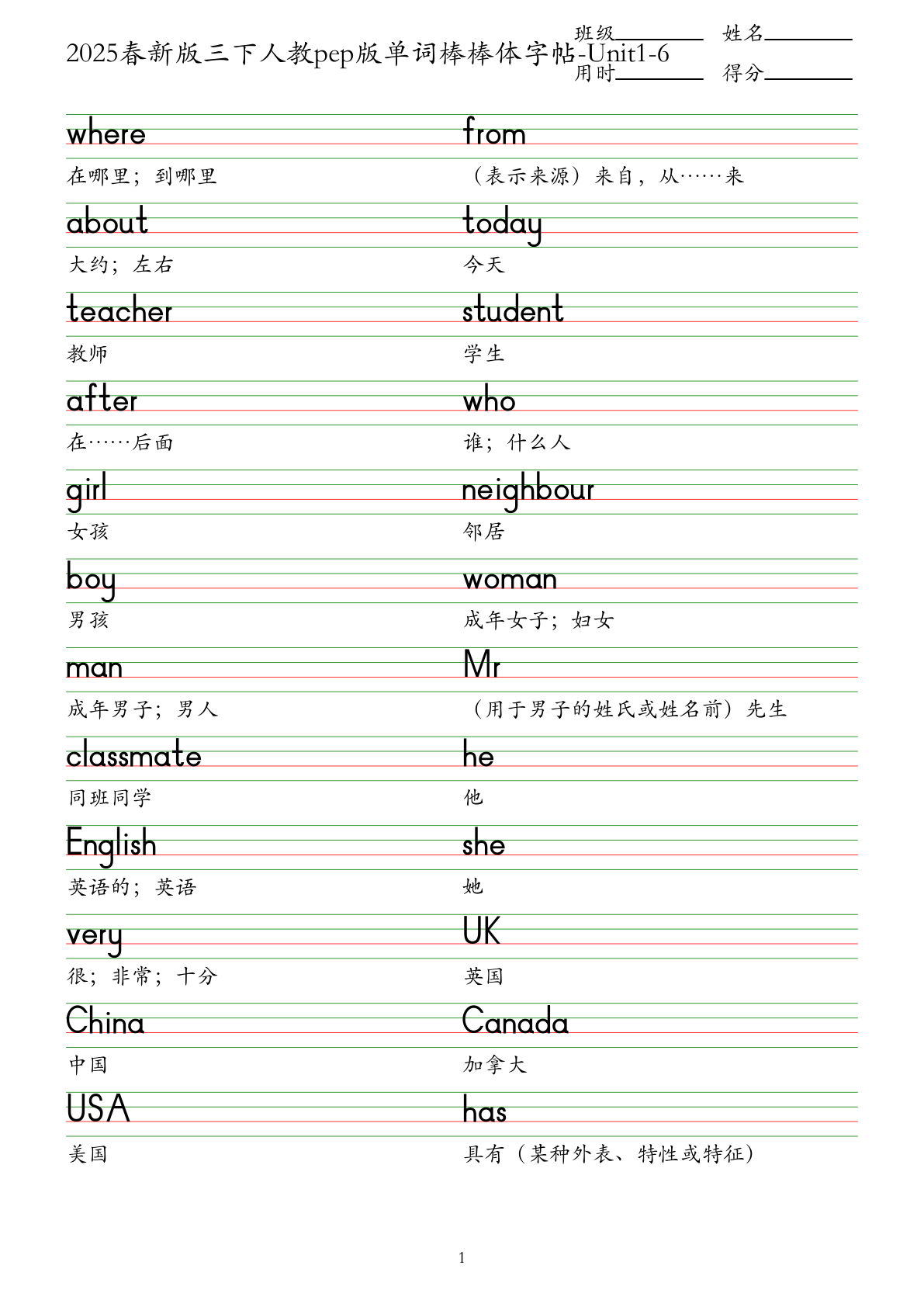 对于小学三年级学习人教PEP版英语的孩子来说,规范书写单词是夯实英语基础的关键环节。今天为大家推荐的2025春新版三年级英语下册人教PEP版单词棒棒体字帖,覆盖教材Unit1至Unit6全部核心单词,以“棒棒体”为书写标准,既能帮助孩子掌握正确的单词拼写,又能培养工整的书写习惯,是小学英语书写训练中实用性极强的高清可打印教辅资源,尤其适合家长辅导和老师课堂练习使用。