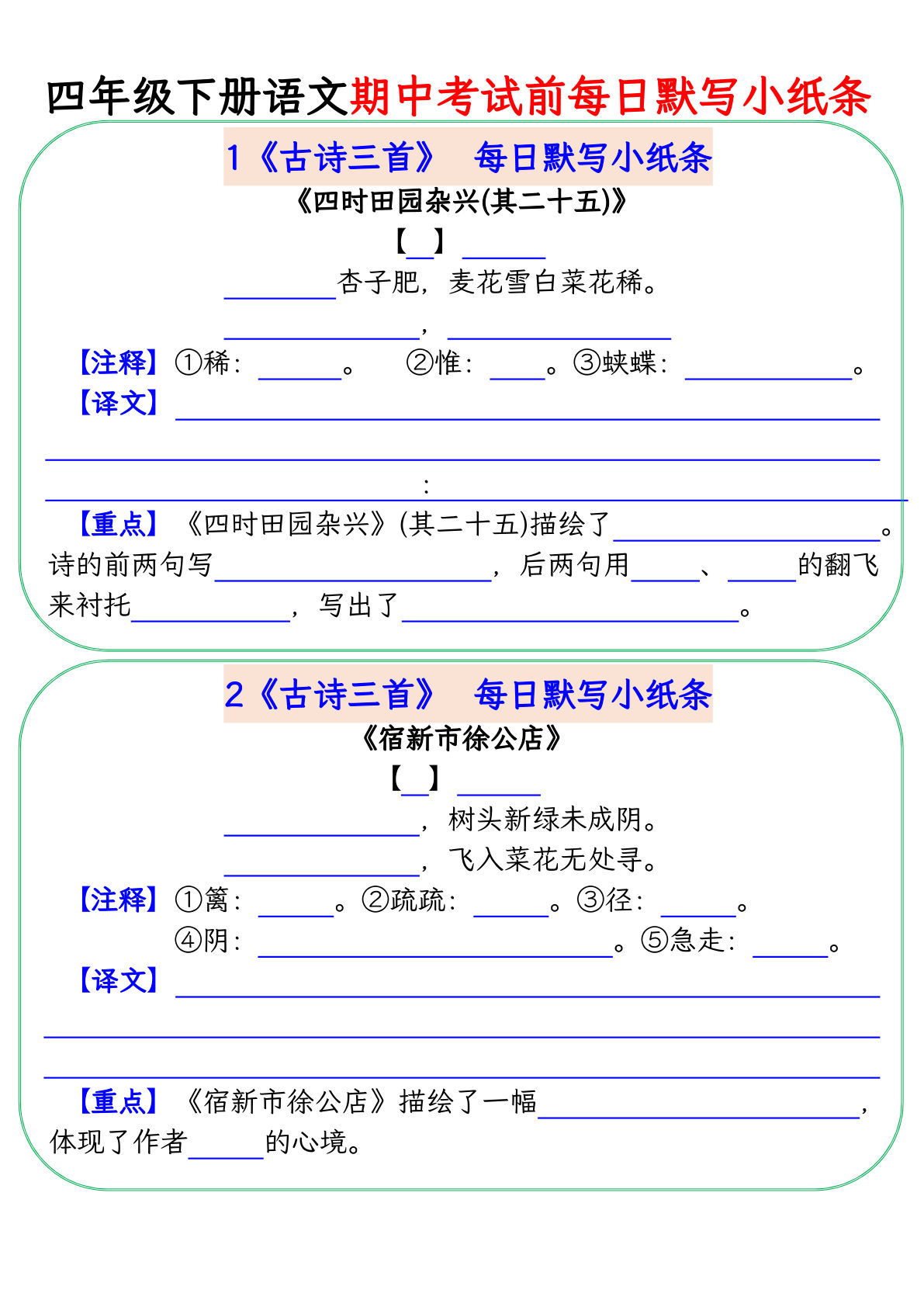 期中考试即将到来,四年级语文复习进入关键阶段。这份《四年级下册语文期中考试前每日默写小纸条》PDF资源,为小学生量身打造,采用每日一练的形式帮助学生巩固知识点。这份四年级语文默写资料设计科学合理,便于学生坚持每日复习,提升学习效果。