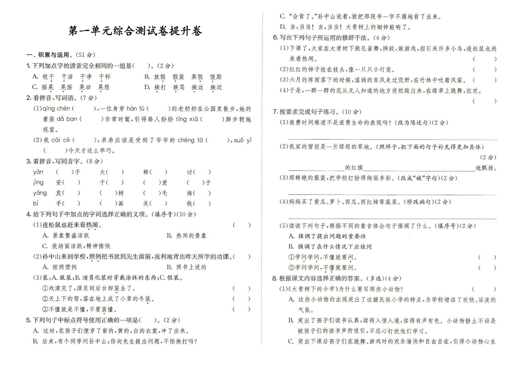 小学三年级语文学习是打基础的关键阶段,部编版教材注重培养学生的语言表达能力和阅读理解能力。这份第一单元综合测试卷【提升卷】专为提升学生语文水平设计,题目涵盖拼音、词语、句子和短文阅读等内容。试卷特点:题目难度适中偏上,既巩固基础知识,又适当拓展思维。高清PDF格式,打印效果清晰,方便学生练习和家长辅导。