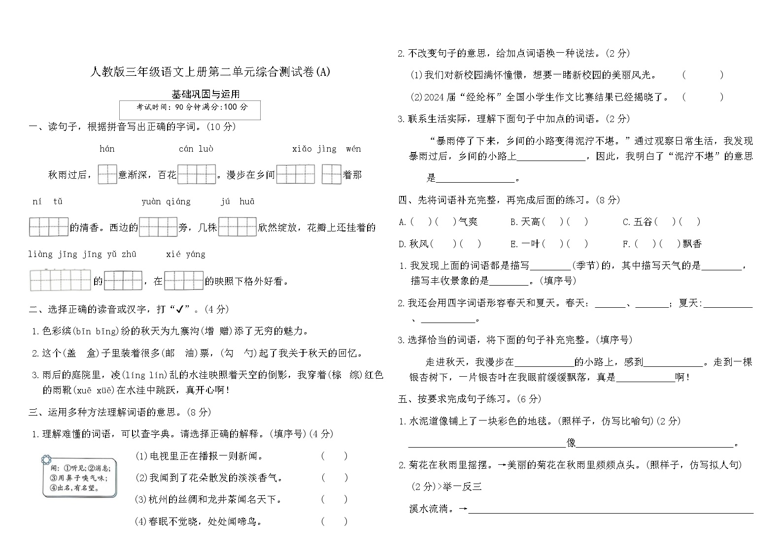 ✏️ 第二单元语文综合测试卷推荐 鸡娃题库继续为您带来人教版三年级语文上册第二单元综合测试卷(A),包含完整答案,全部内容免费下载,助力孩子语文学习! 🌟 本套试卷针对第二单元重点内容设计,涵盖字词、阅读、写作等多个方面,能够有效检验孩子对单元知识的掌握程度。 📝 试卷设计科学合理,难度适中,既注重基础知识的巩固,又兼顾能力提升。是家长辅导孩子学习的优质资源。 百度网盘