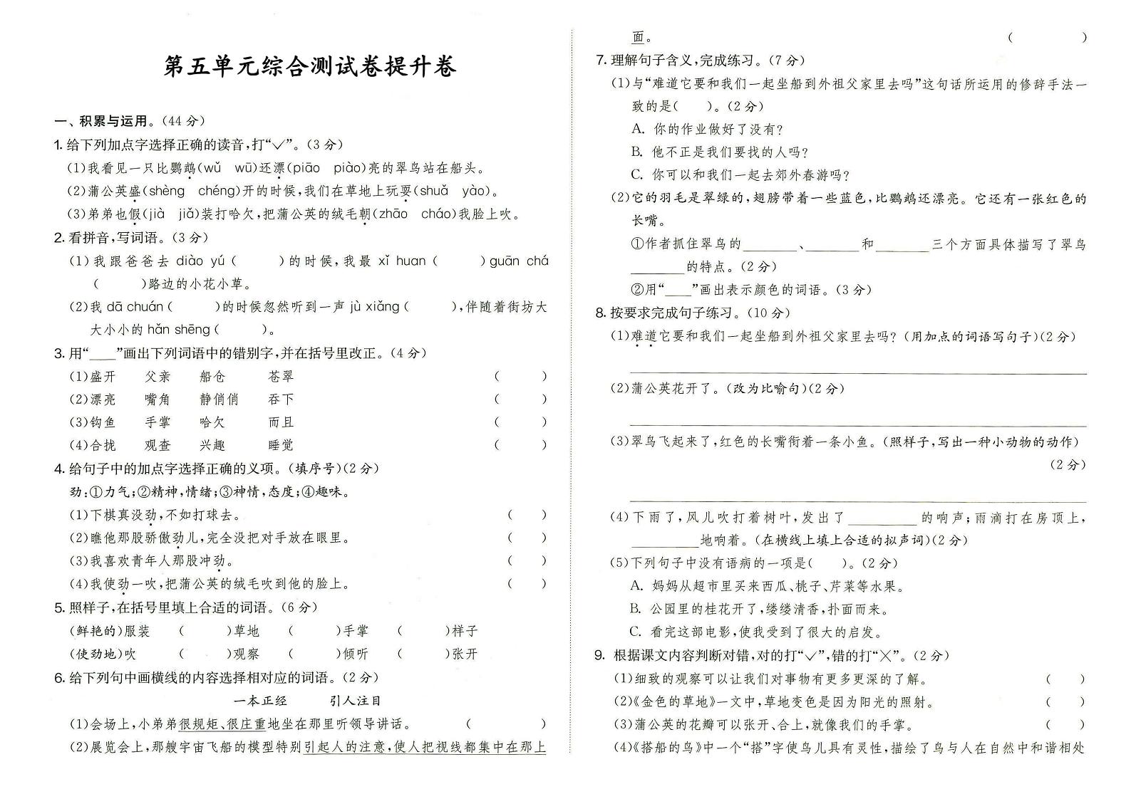 第五单元内容更加丰富多样,这套提升卷针对单元重点难点设计,题目类型全面,难度适中偏高,适合想要挑战自我的学生。核心价值:通过练习可以巩固课堂知识,发现学习盲点,提升应试能力。所有题目都经过精心设计,避免偏题怪题。答案详细规范,便于自学。📌