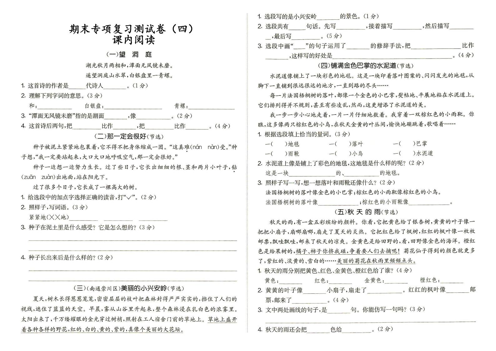 📖 部编版三年级上册语文期末课内阅读专项卷(四)
