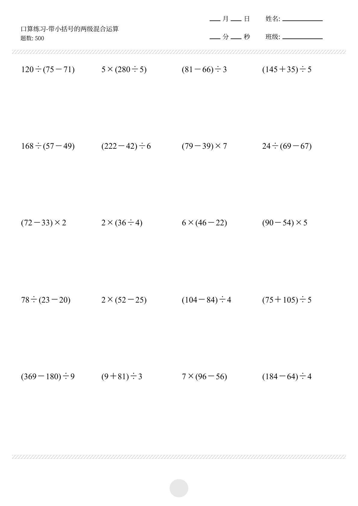 这套练习资源共25页,每页20道题目,题型丰富多样。题目设计遵循由浅入深的原则,既包含基础运算训练,也设置了适当难度的提升题目。所有题目都围绕带小括号的两级混合运算展开,确保学生能够熟练掌握运算规则。
