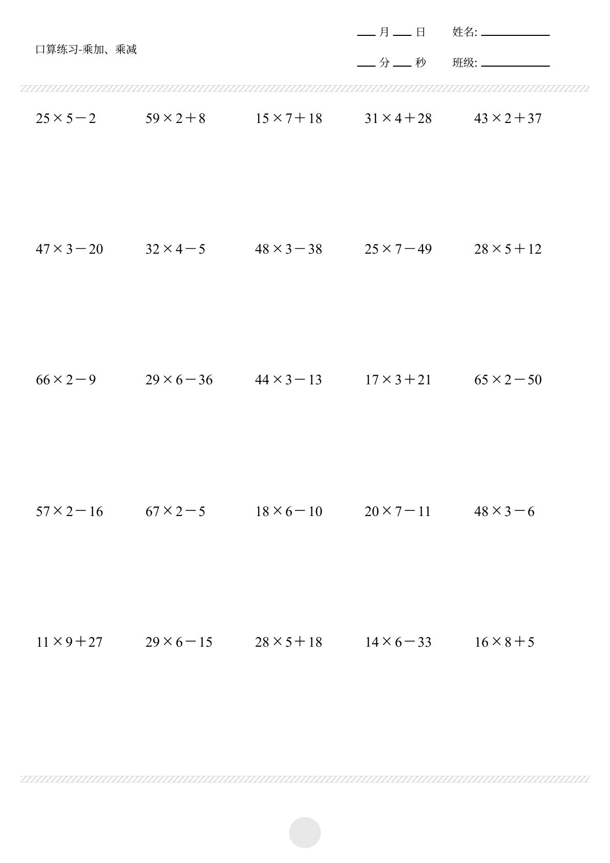 这套练习资源共40页,每页25道题目,题型丰富多样。题目设计遵循循序渐进的原则,从简单到复杂,逐步提升学生的运算能力。所有题目都围绕乘加乘减混合运算展开,确保学生能够熟练掌握运算规则。