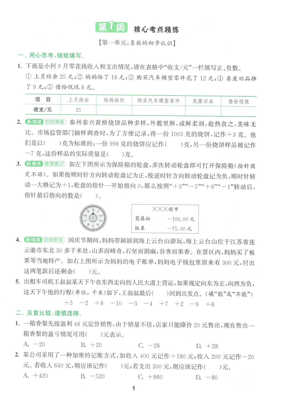 资源共分16周训练内容,每周围绕一个核心单元展开。题目类型包括填空题、选择题、计算题、应用题,涵盖基础巩固与能力提升。例如第一单元“负数的初步认识”中,通过零花钱收支、烧饼重量记录、保险箱转盘等生活情境,帮助学生理解正负数的实际意义。