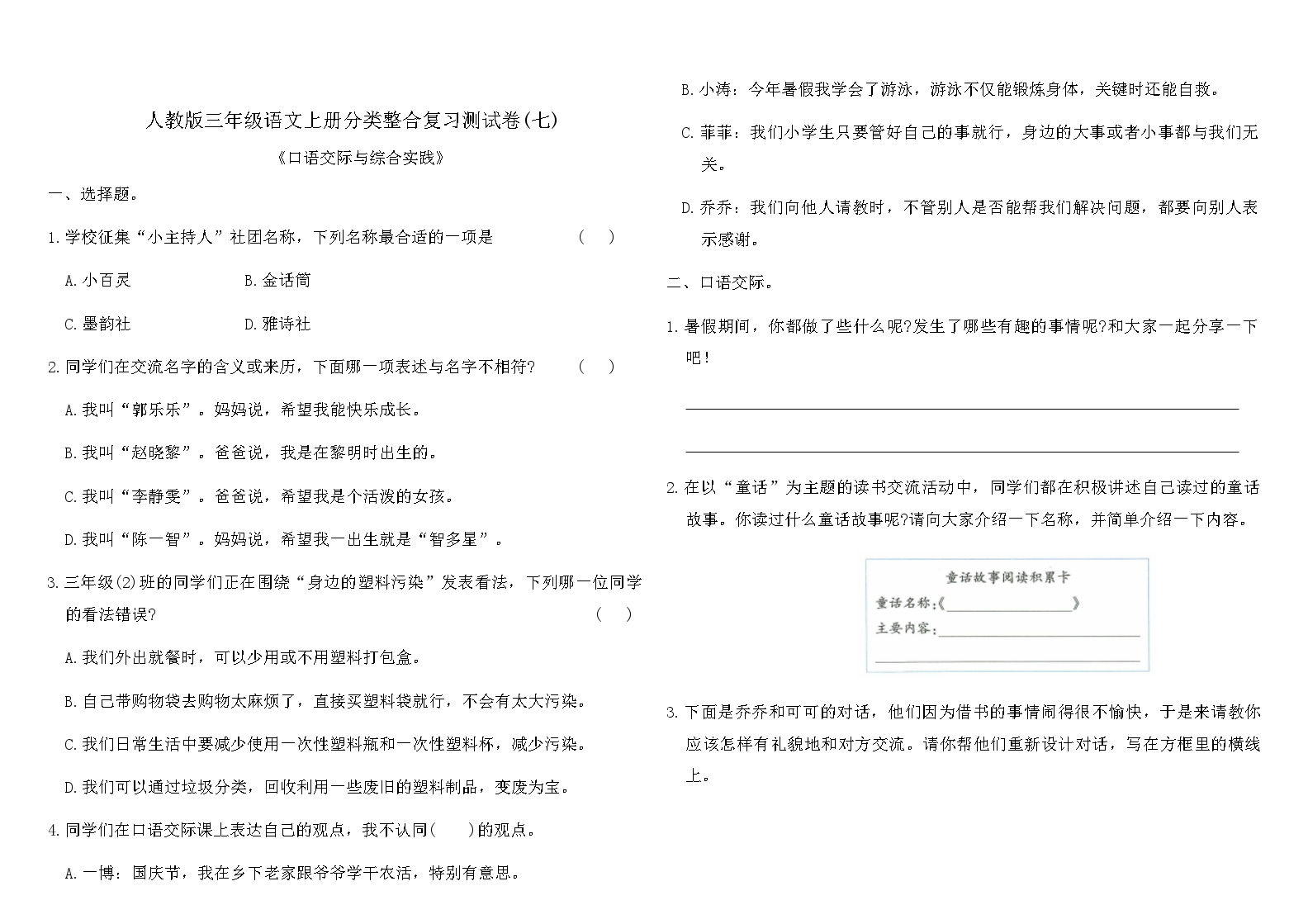 鸡娃题库圆满收官!为您奉上人教版小学三年级语文上册分类整合复习测试卷(七)(含答案),本卷是综合检测与能力评估📊。