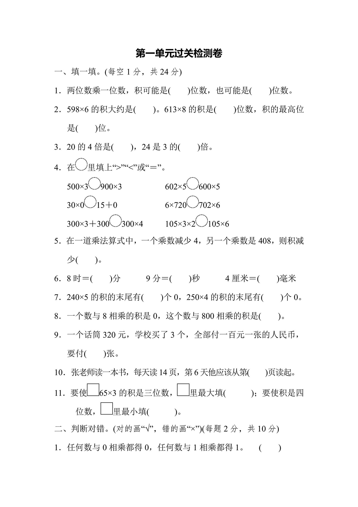 三年级上册数学苏教版第一单元过关检测卷 📚