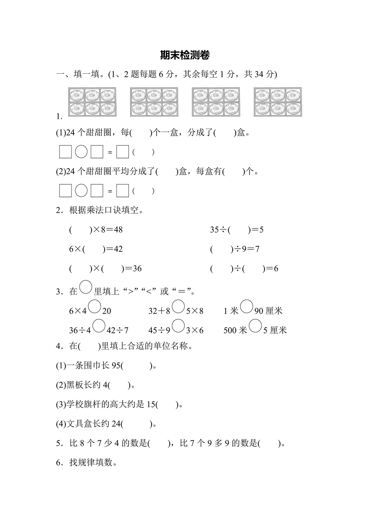 期末检测卷严格依据苏教版教材编写,全面覆盖二年级上册数学知识点,是检验学期学习成果的理想工具。