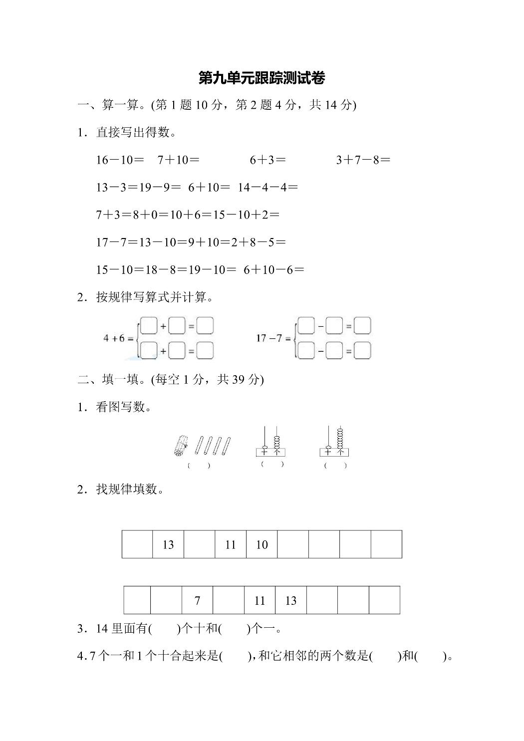 🧩 一年级数学第9单元检测卷|苏教版同步|高清可打印