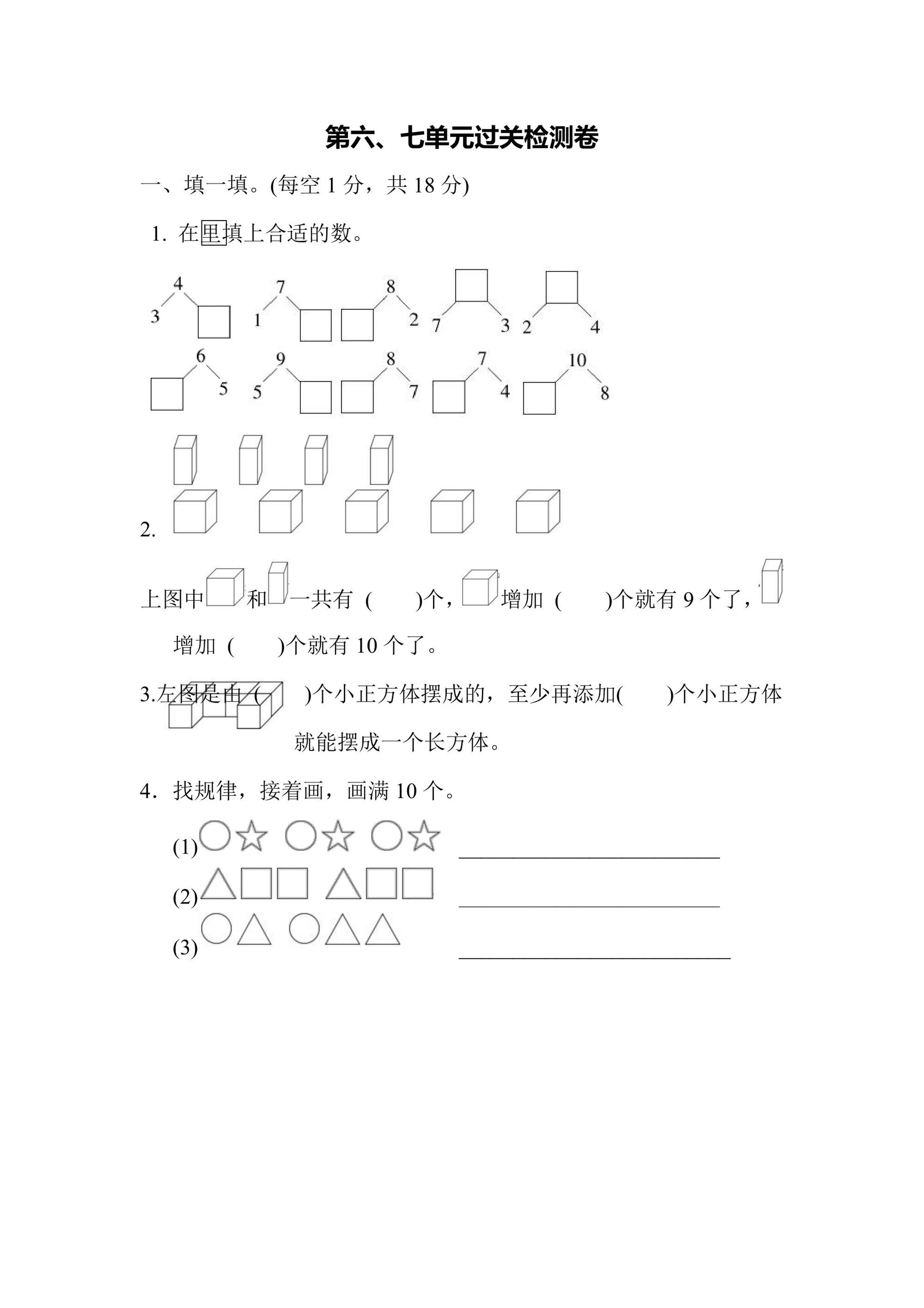 🔢 一年级数学6-7单元综合测试|苏教版|可打印PDF