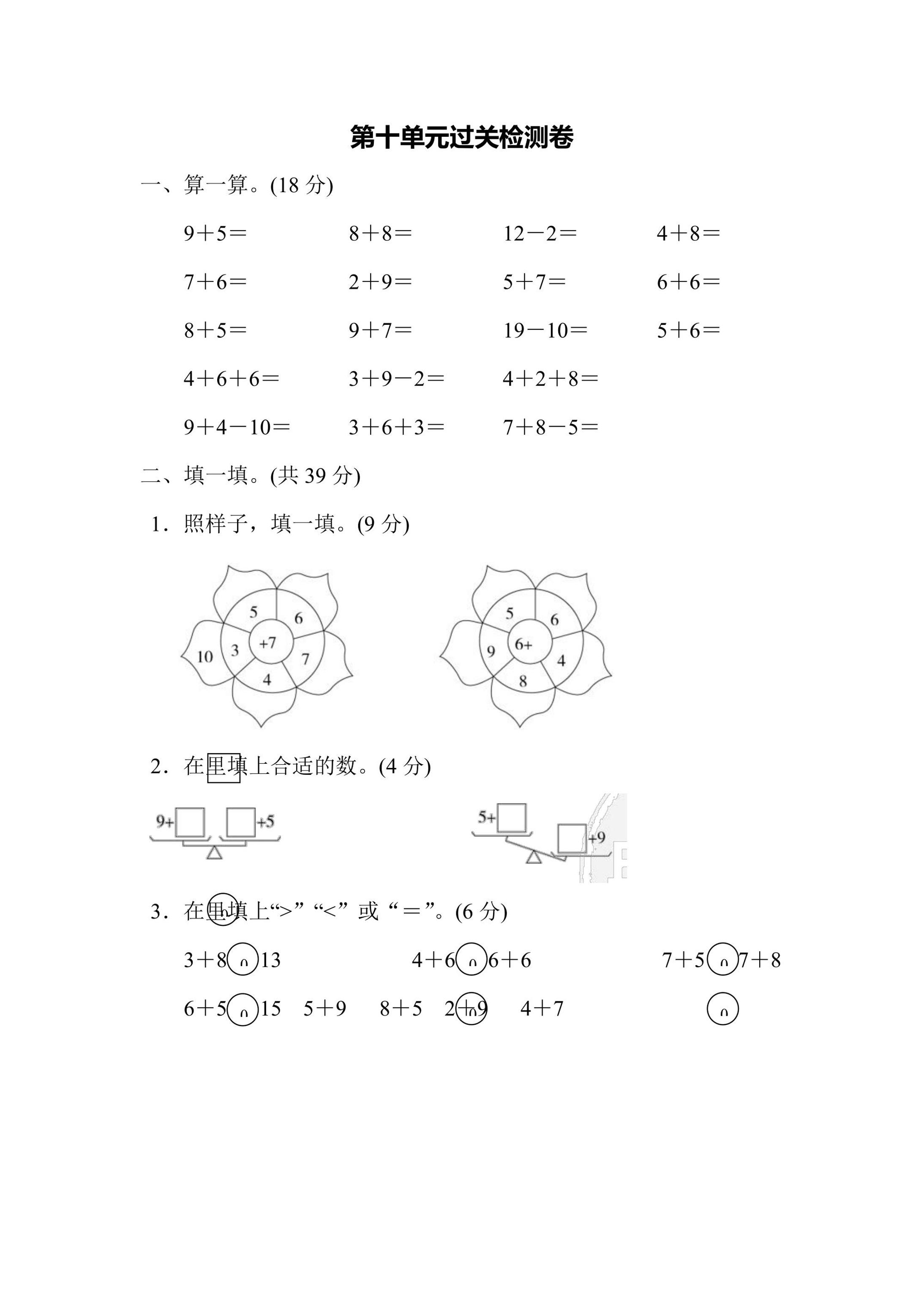 🎯 一年级数学第10单元期末检测|苏教版|免费下载