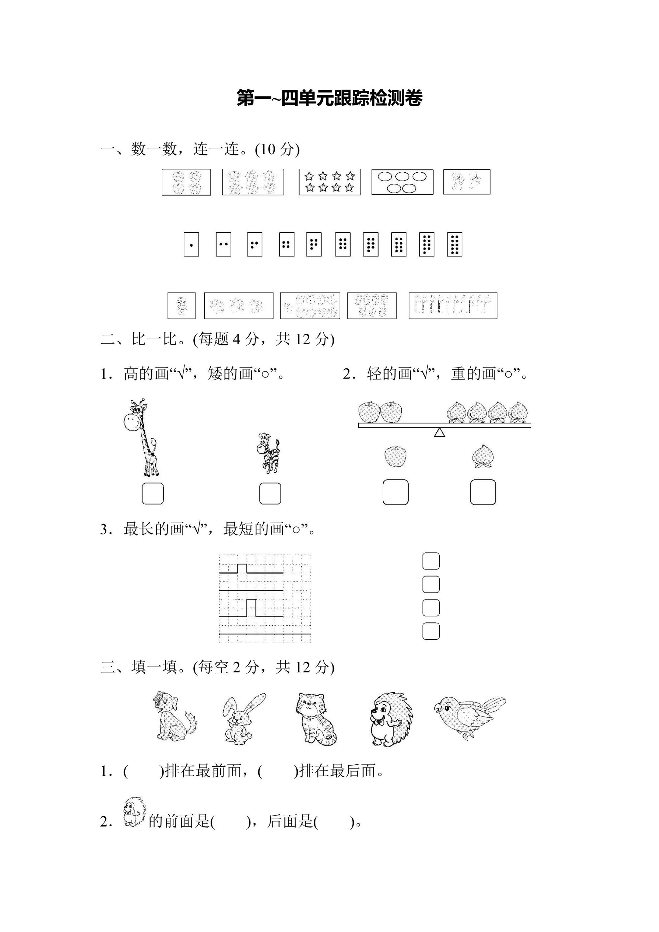 这份检测卷由专业教师团队编写,题目设计符合一年级学生认知特点,能够有效检测孩子对1-4单元知识的掌握情况。💯