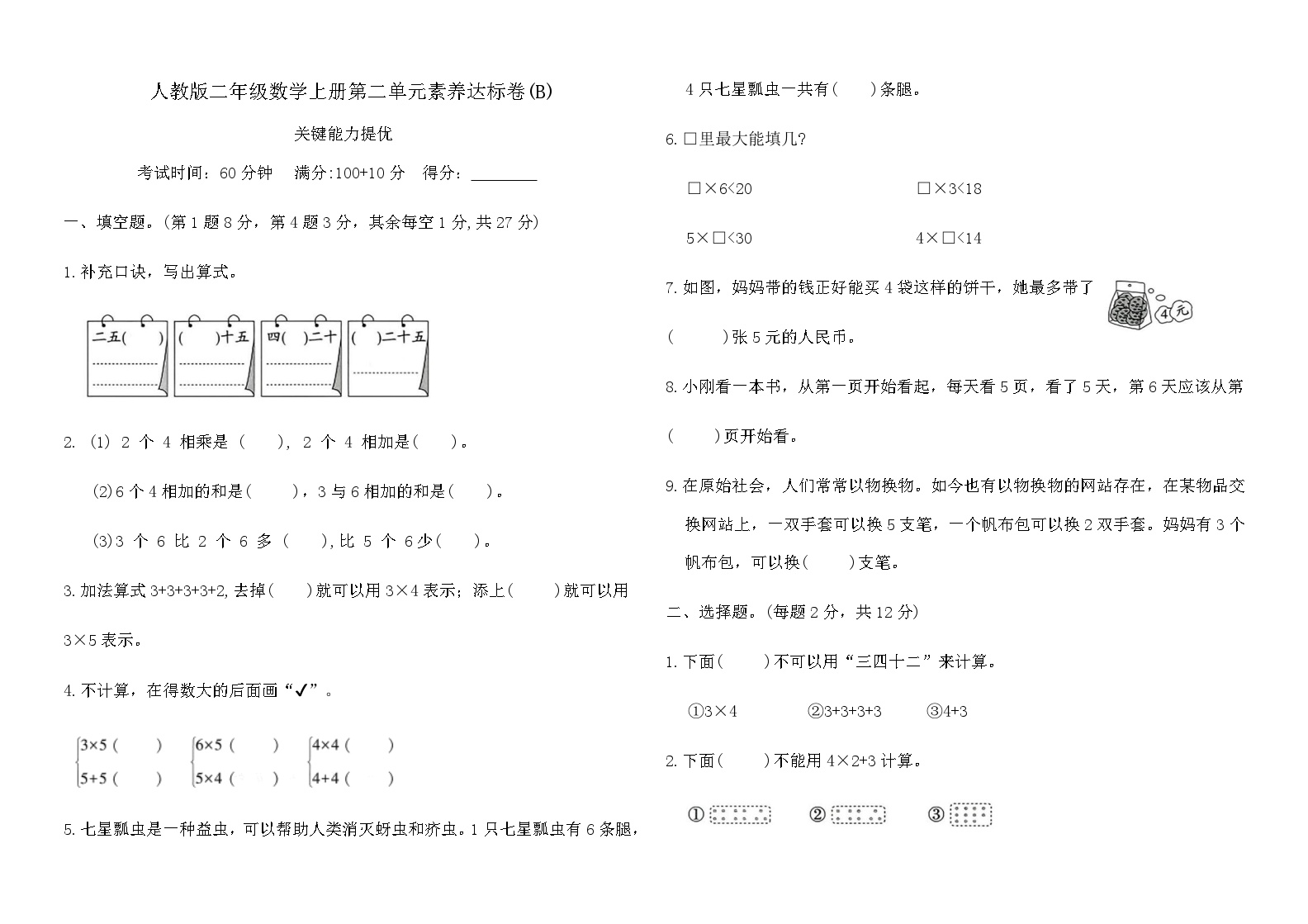 🧮 二年级数学上册第二单元测试卷(B)分享