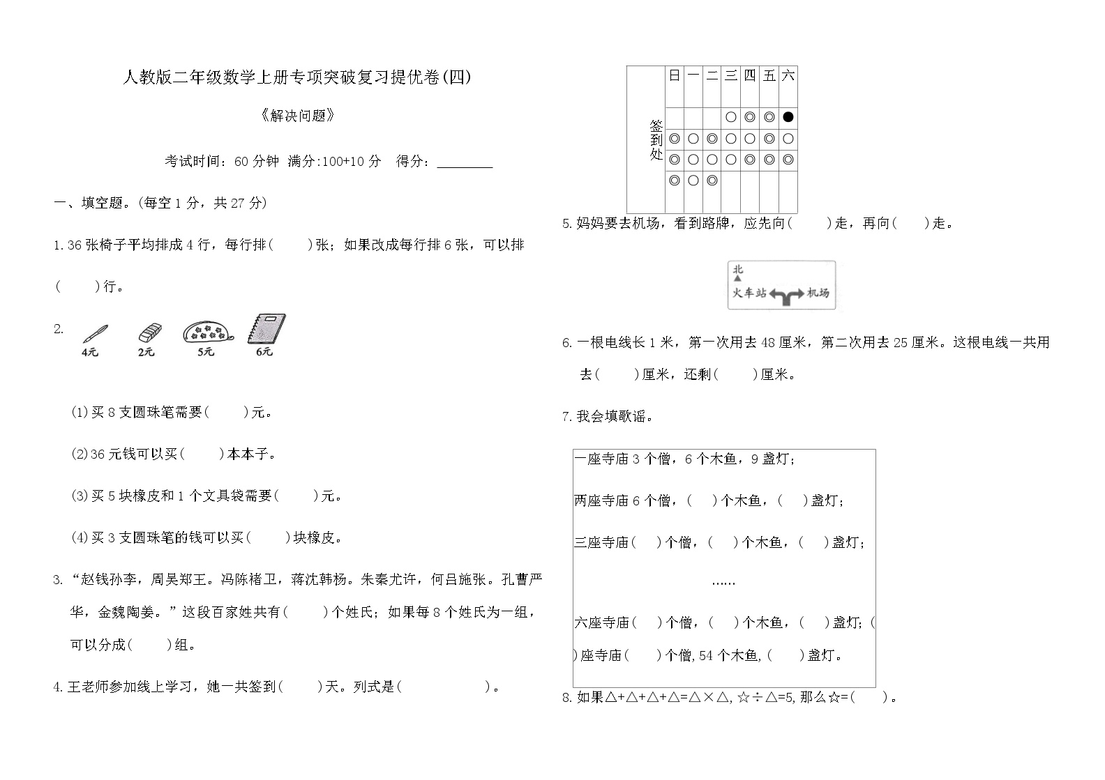 人教版二年级数学上册专项突破复习提优卷(四)是系列复习资料的最后一套,也是难度最高的一套,适合作为期末总复习的模拟测试使用。