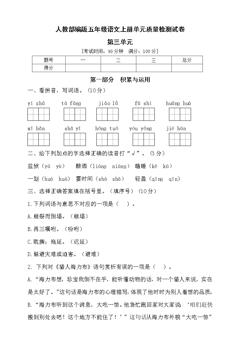 部编版五年级语文上册第三单元达标测试卷3全新升级!本套试卷在专家指导下完成命题,更加注重考查学生的语文综合运用能力。