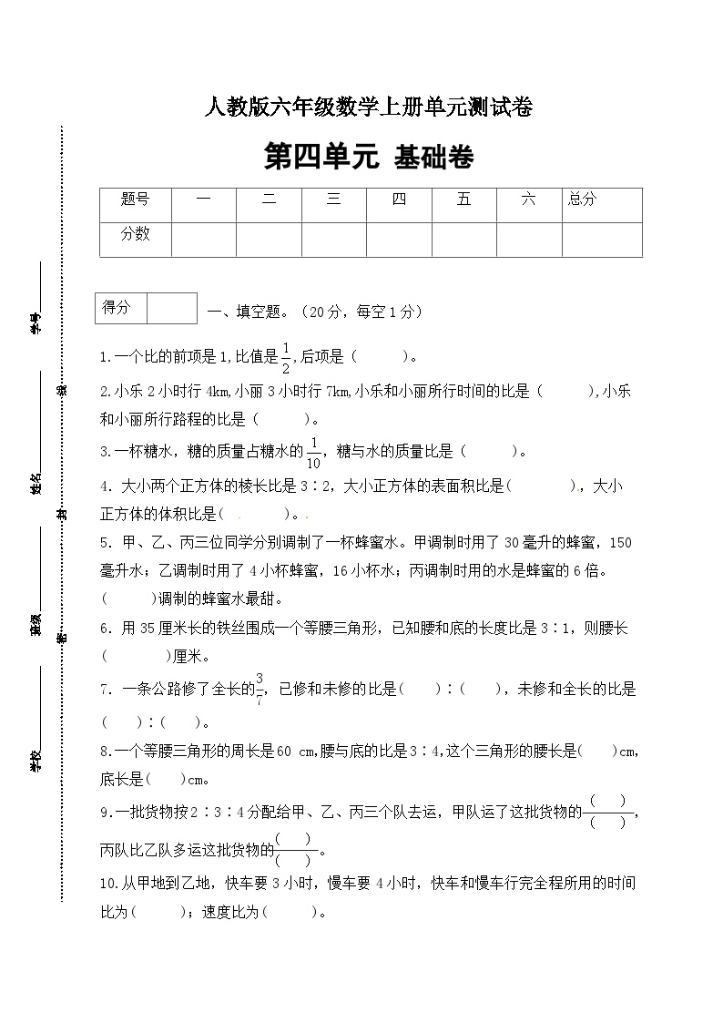 这份人教版六年级数学第四单元测试卷是理解比概念的优质练习材料,高清可打印的特性让家庭辅导更加得心应手!
