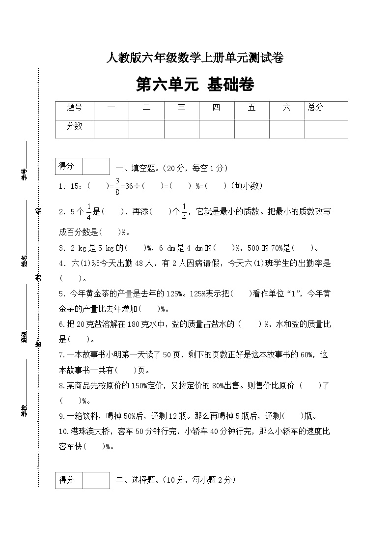 这份人教版六年级数学第六单元测试卷是掌握百分数知识的优质资源,高清可打印的特性让学习更加灵活方便!
