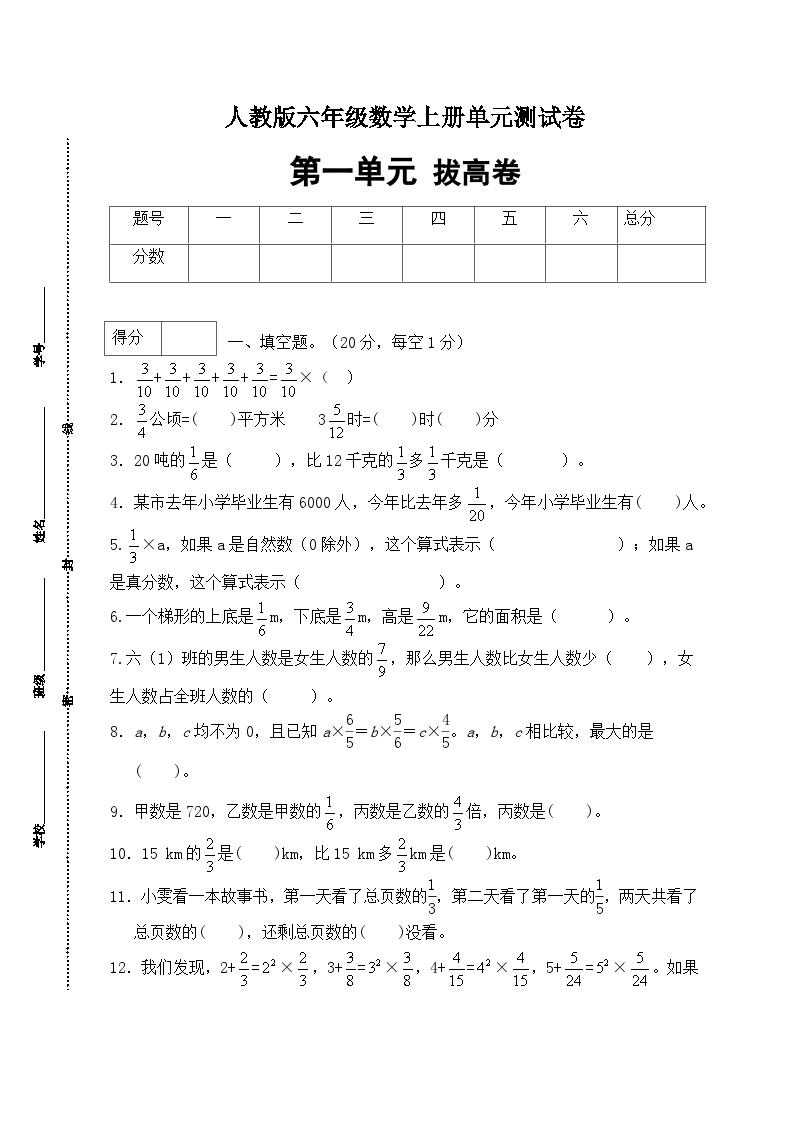 这份人教版六年级数学第一单元拔高卷是提升数学能力的优质资源,高清可打印的设计让学习更加灵活!