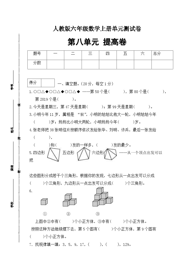 这份人教版六年级数学第八单元拔高卷是培养创新思维的优质资源,高清可打印的特性让学习更加丰富多彩!