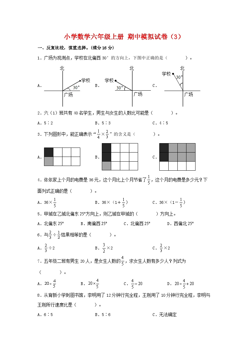 这份人教版六年级数学期中模拟试卷(3)是检验学习效果的理想工具,高清可打印的设计让复习更加高效!