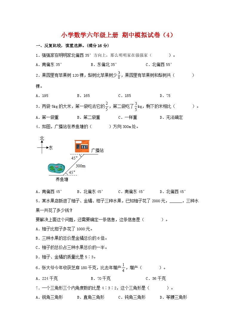 这份人教版六年级数学期中模拟试卷(4)是期中复习的优质资源,高清可打印的特性让备考更加得心应手!