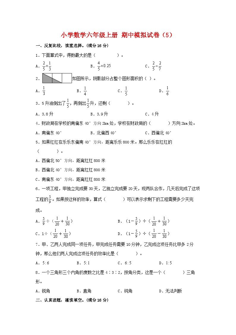 🎯 六年级数学上册期中模拟试卷(5)发布