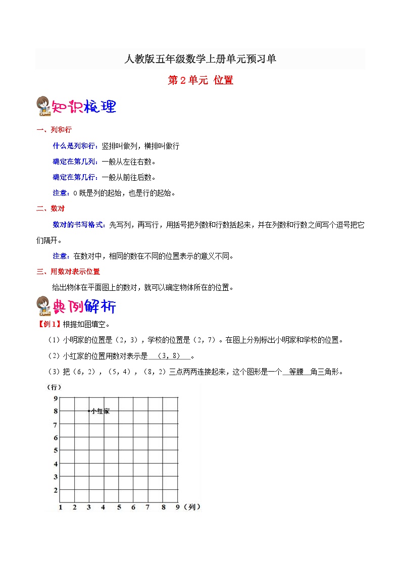 我们整理了人教版五年级数学上册第二单元全套知识清单,包含位置表示方法图解、典型例题和趣味练习题,高清可打印版本方便孩子学习使用。