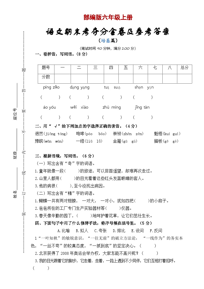 🌟 六年级语文上册期末模拟卷(培基篇)重磅发布
